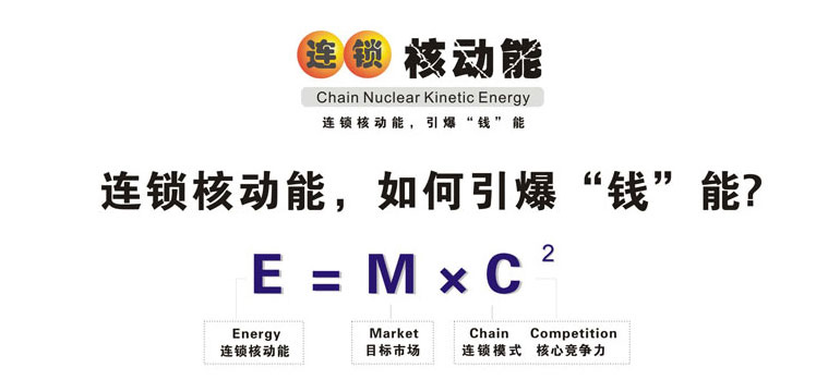 ,這是世界著名的愛因斯坦能量公式。基于愛因斯坦的相對論和能量公式,產(chǎn)生了原子彈和核電站,今天的人類太空實踐證實了愛因斯坦理論的正確性,人類因此發(fā)生了翻天覆地的變化。在愛因斯坦的能量公式中,M是質(zhì)量,C是光速,當速度為光速時,即使很小的質(zhì)量也能轉(zhuǎn)化為非常大的能量。 廣州采納企業(yè)管理顧問有限公司首席咨詢師陳宏創(chuàng)建的的連鎖核動能理論(全名:連鎖內(nèi)核能量裂變激增理論)是以愛因斯坦的能量公式為基礎(chǔ)創(chuàng)建,但其含義和指向是不同的:M=目標市場(Market),C1=連鎖模式(Chain),C2 =核心競爭力(Competition),其理論意義是,企業(yè)找準了目標市場,以連鎖的方式經(jīng)營,核心競爭力越大,推動其發(fā)展能量就越大。 連鎖核動能理論如何幫助連鎖企業(yè)“引爆錢能”快速發(fā)展?我們用深入淺出的圖形表達方式對該理論進行分層闡述: